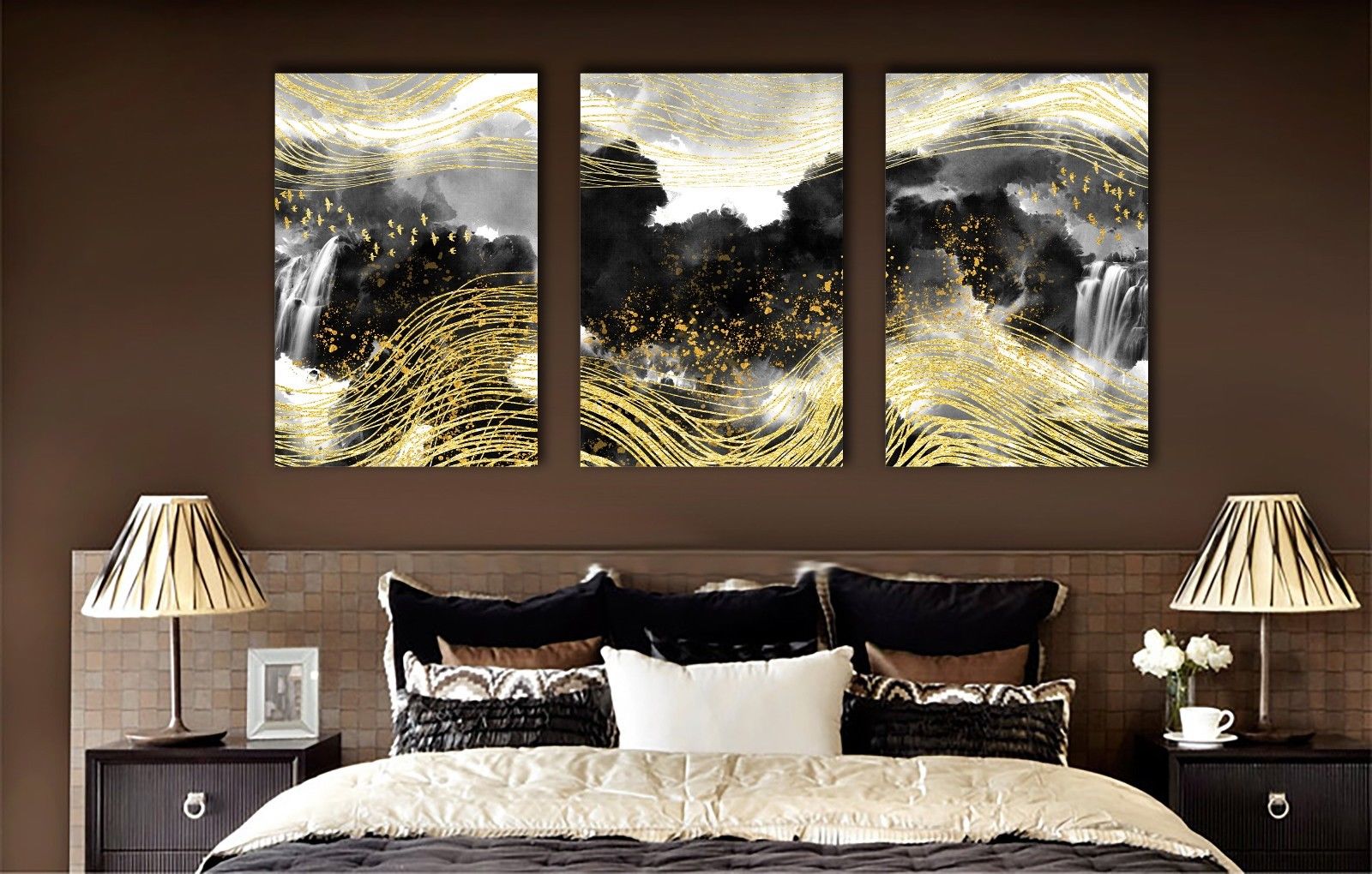 Abstract Gold Line Bird Waterfall Framed Canvas Ink Painting Modern Wall Art