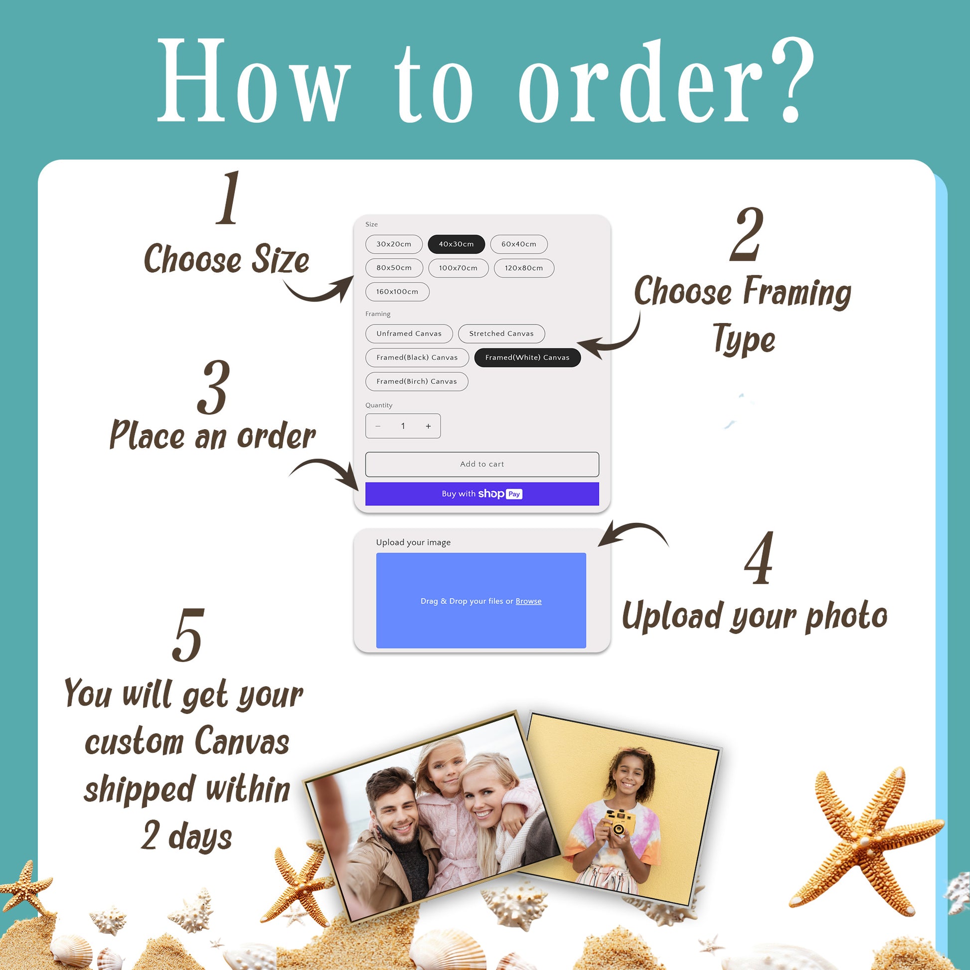 In the blue box above, simply drag and drop your files.. or click browse to select an image from your device. Add the canvas sizes you want to your cart, and click "Add to Cart". We will begin processing your order after that, with a typical turnaround of 1-2 business days.