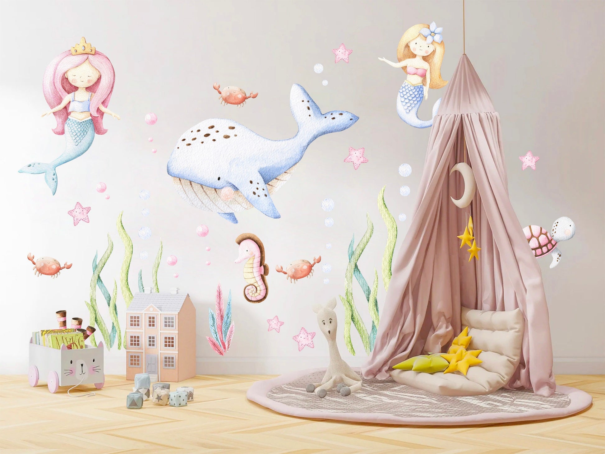 Undersea Wonderland Wall Decal - Whale Mermaid Seahorse and Seaweeds Playful Scene for Kids Room Decor - BR101