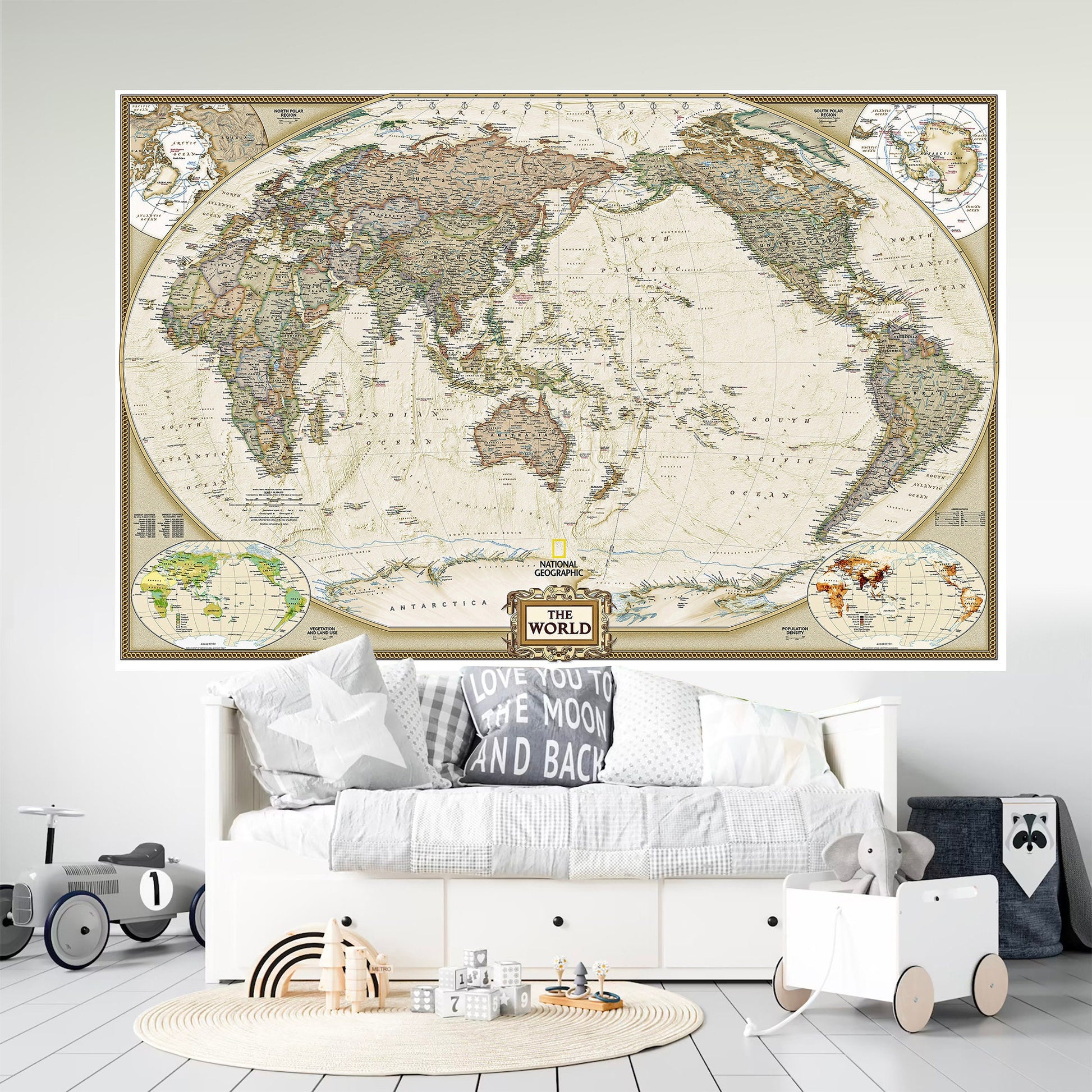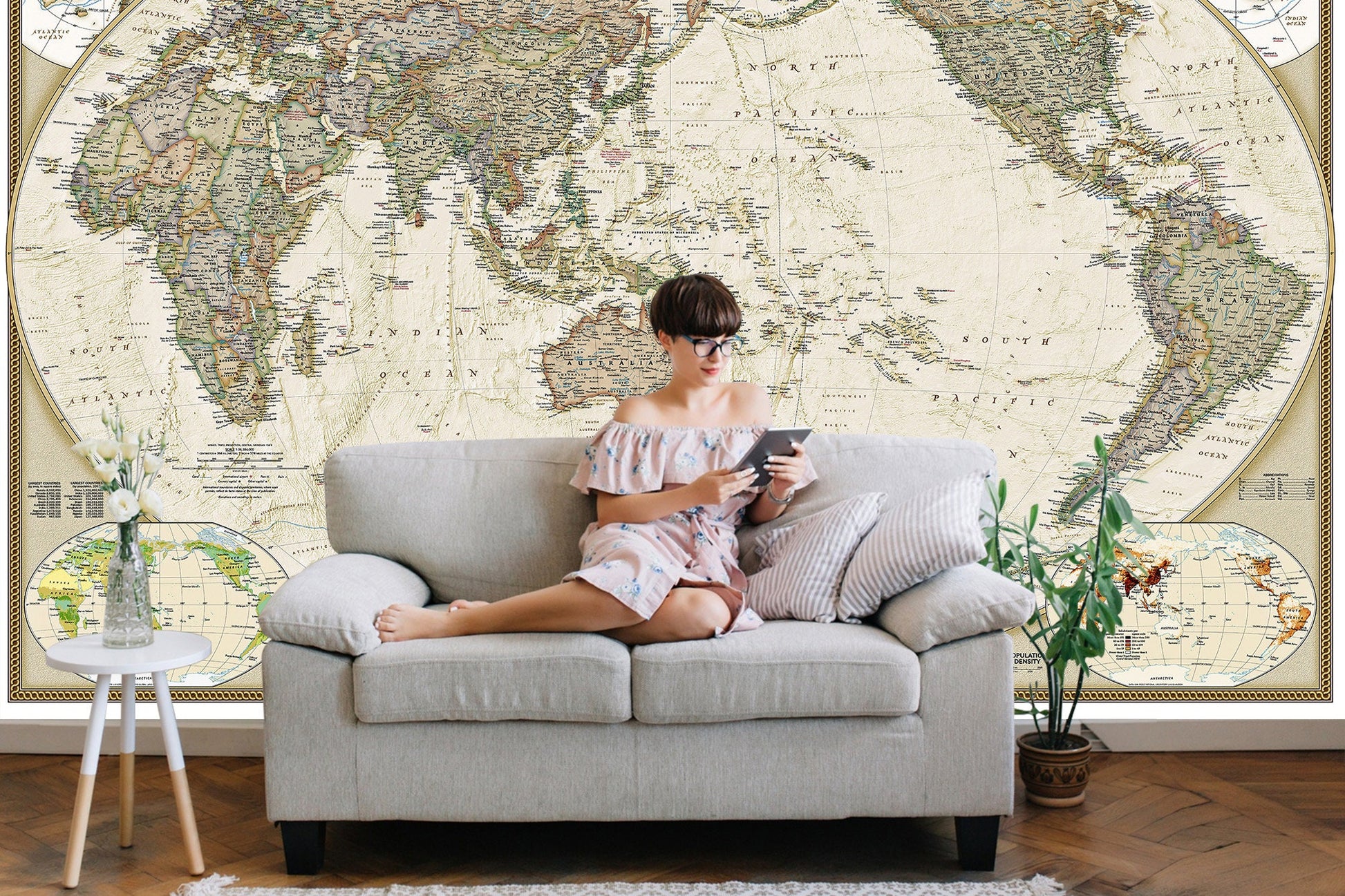 Vintage World Map Fabric Wallpaper Peel and Stick - Printed Wall Murals - Removable Wall Paper - WM002