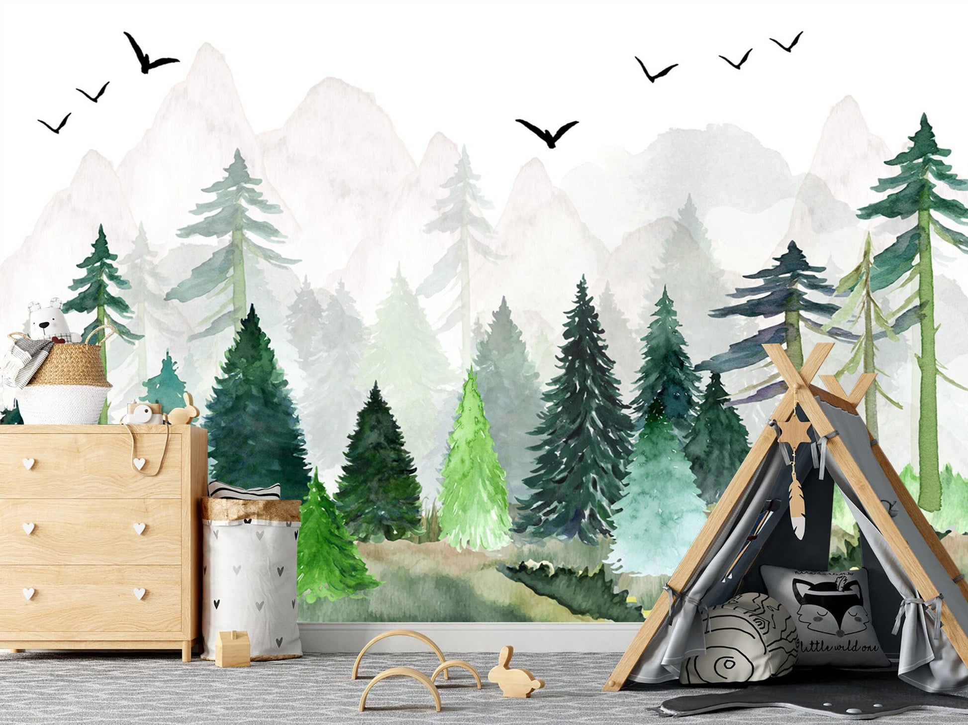 Watercolor Forest Landscape - Trees and Birds - Fabric Wallpaper - WM005