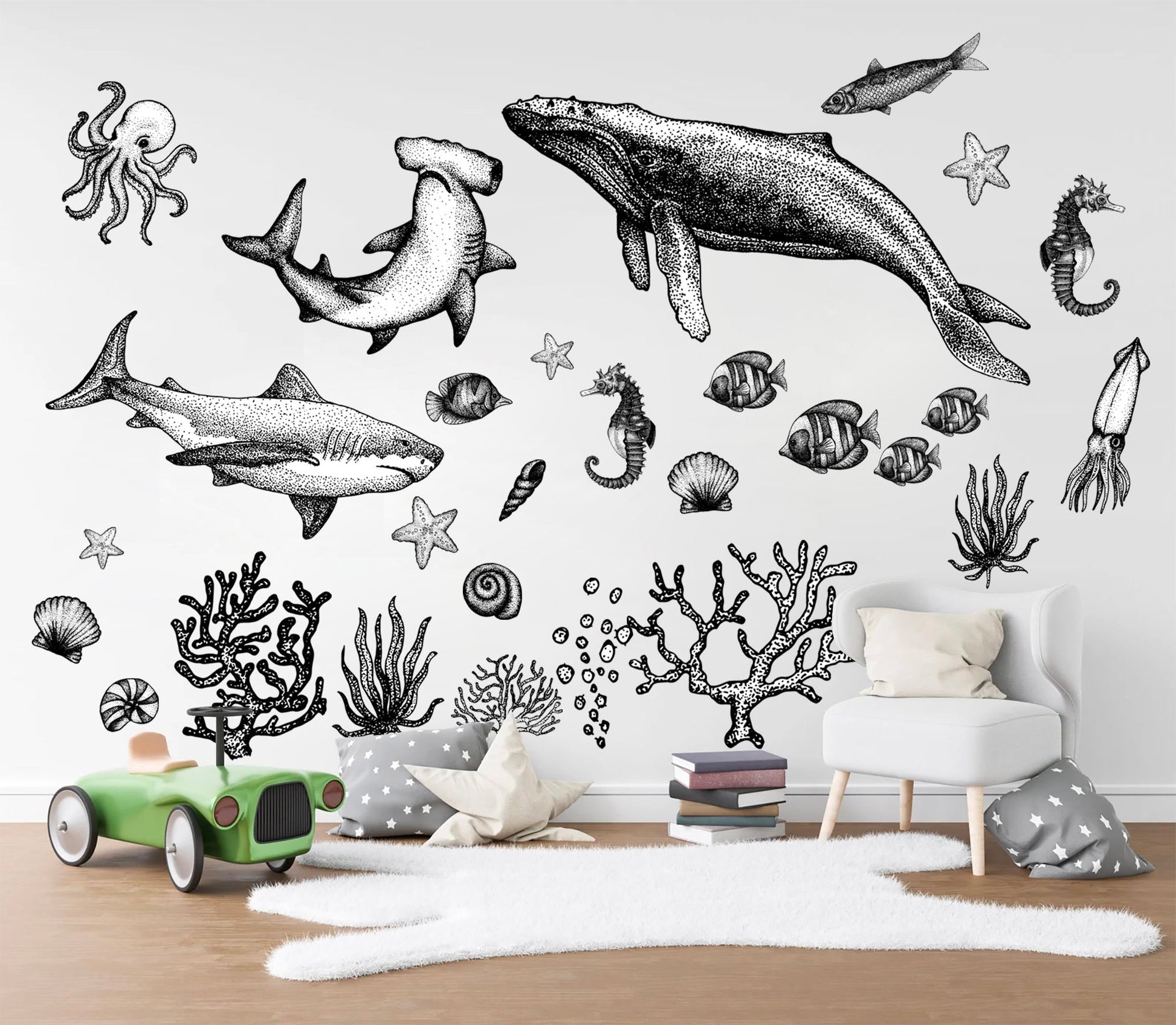 Whimsical Undersea Creatures Wall Decal - Shark Whale Octopus Seahorses Starfish Squid - Monochrome Style - BR248