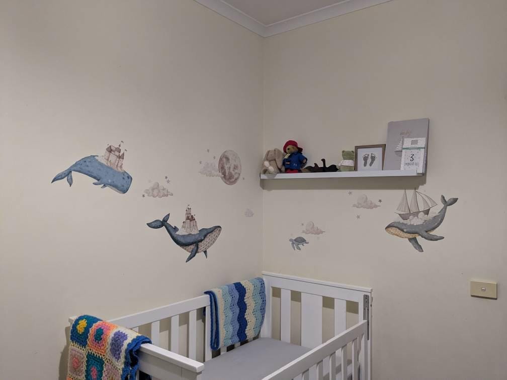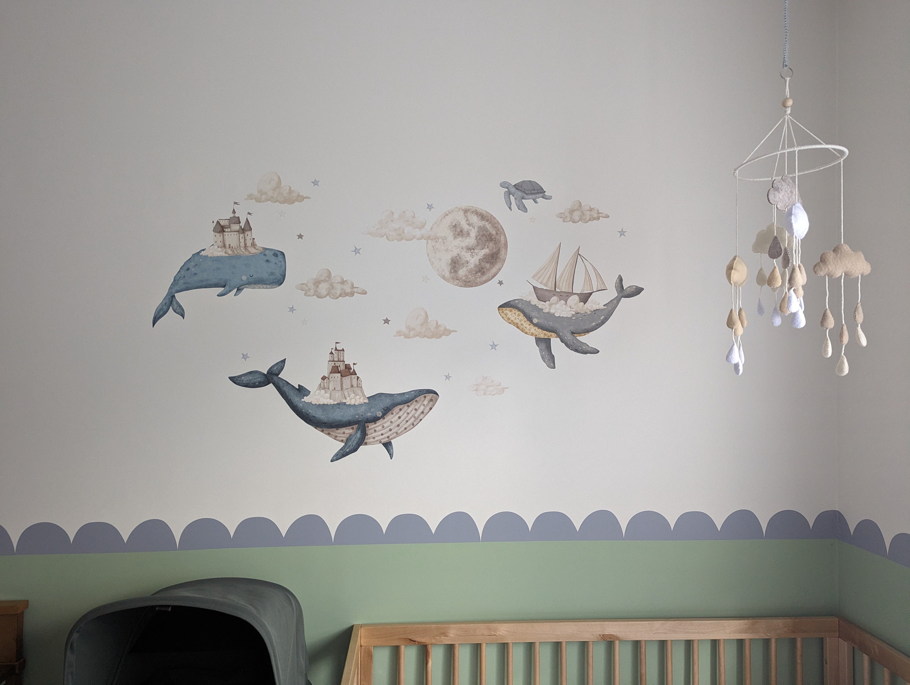Whimsical Whale Sky Castle Wall Decal - Watercolor Moon Room Decor - BR385